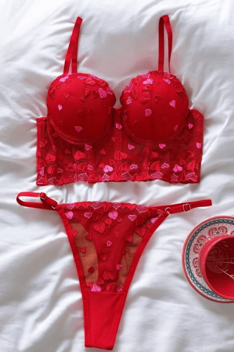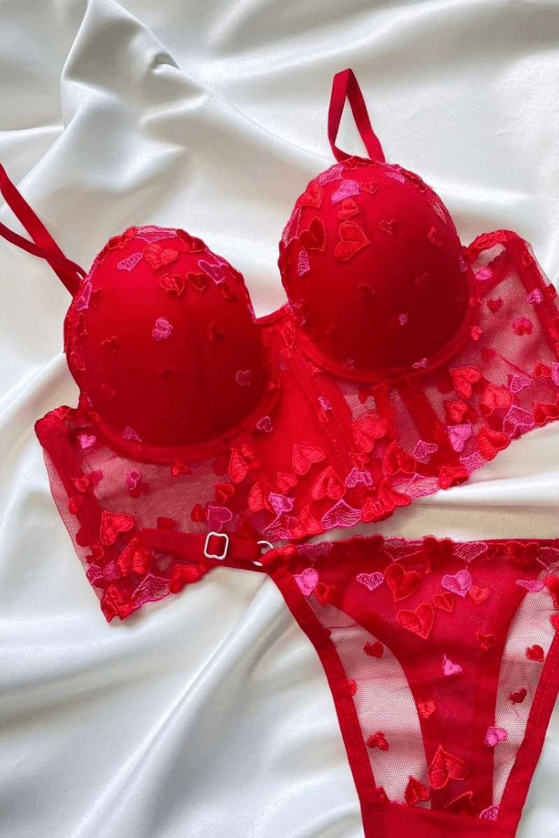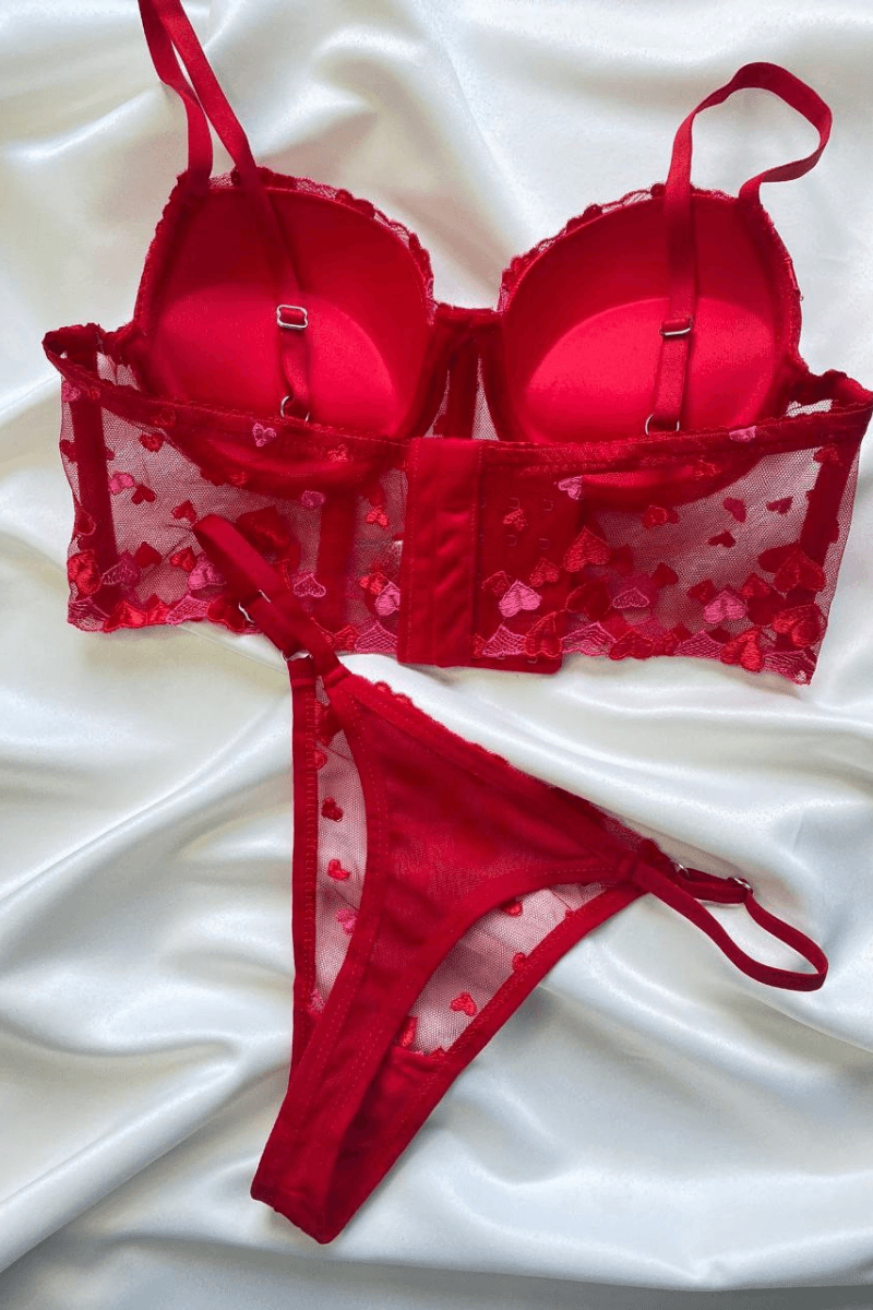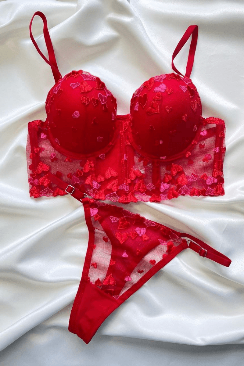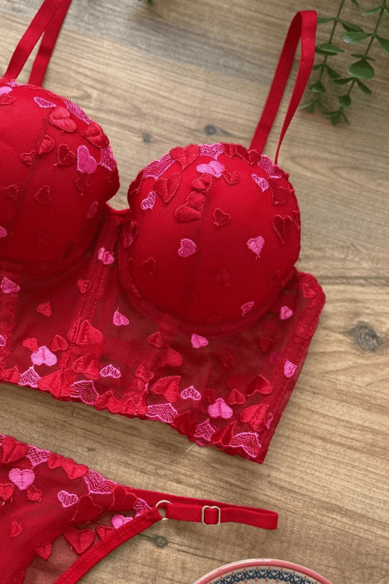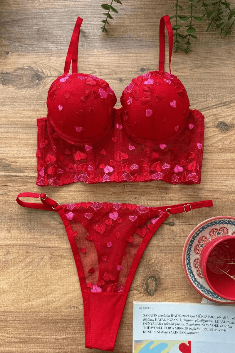 Αναδείξτε τη θηλυκότητά σας με αυτό το εντυπωσιακό κόκκινο σετ εσωρούχων, διακοσμημένο με ρομαντικές καρδιές από λεπτή δαντέλα. Ο σχεδιασμός περιλαμβάνει ενισχυμένο κορσάζ που προσφέρει στήριξη και άψογη εφαρμογή, ενώ το ασορτί σλιπ διαθέτει ρυθμιζόμενες λεπτομέρειες για άνεση. Ιδανικό για ξεχωριστές περιστάσεις ή για να δώσετε μία πινελιά πολυτέλειας στην καθημερινότητά σας. Ένα απόλυτα αισθησιακό κομμάτι που ενισχύει την αυτοπεποίθησή σας!
