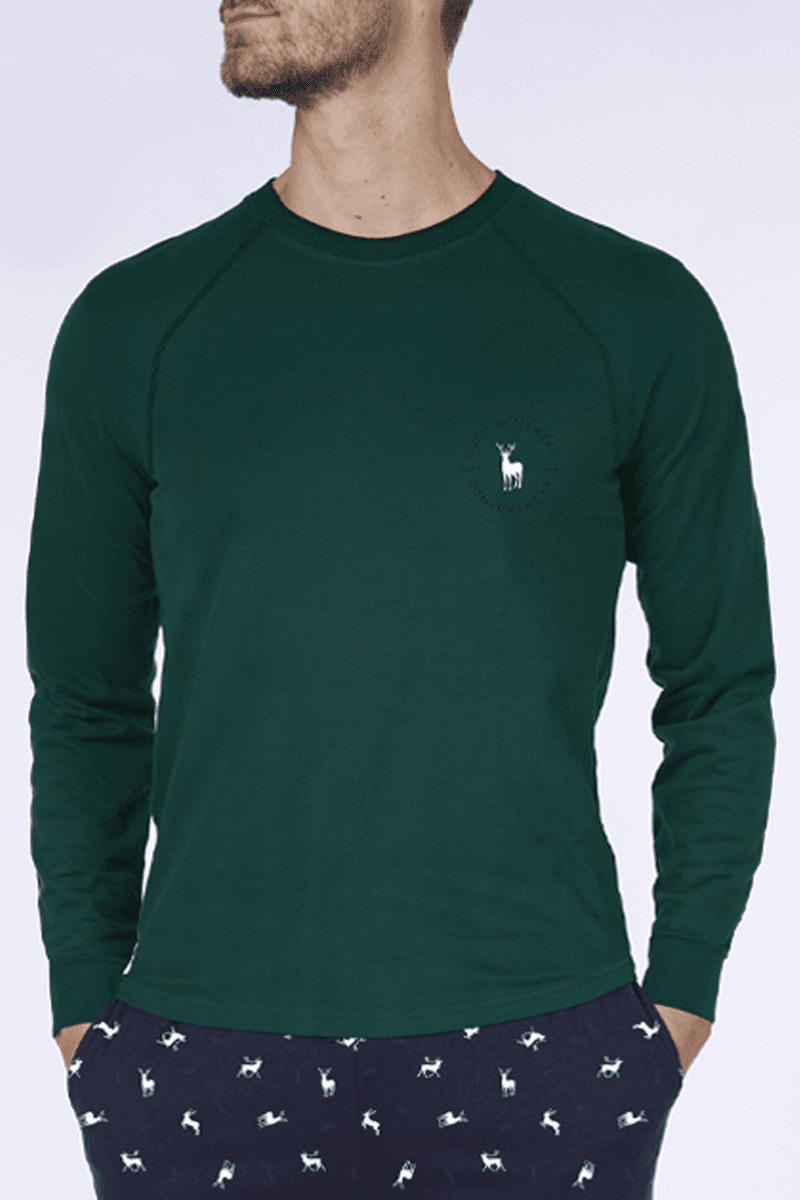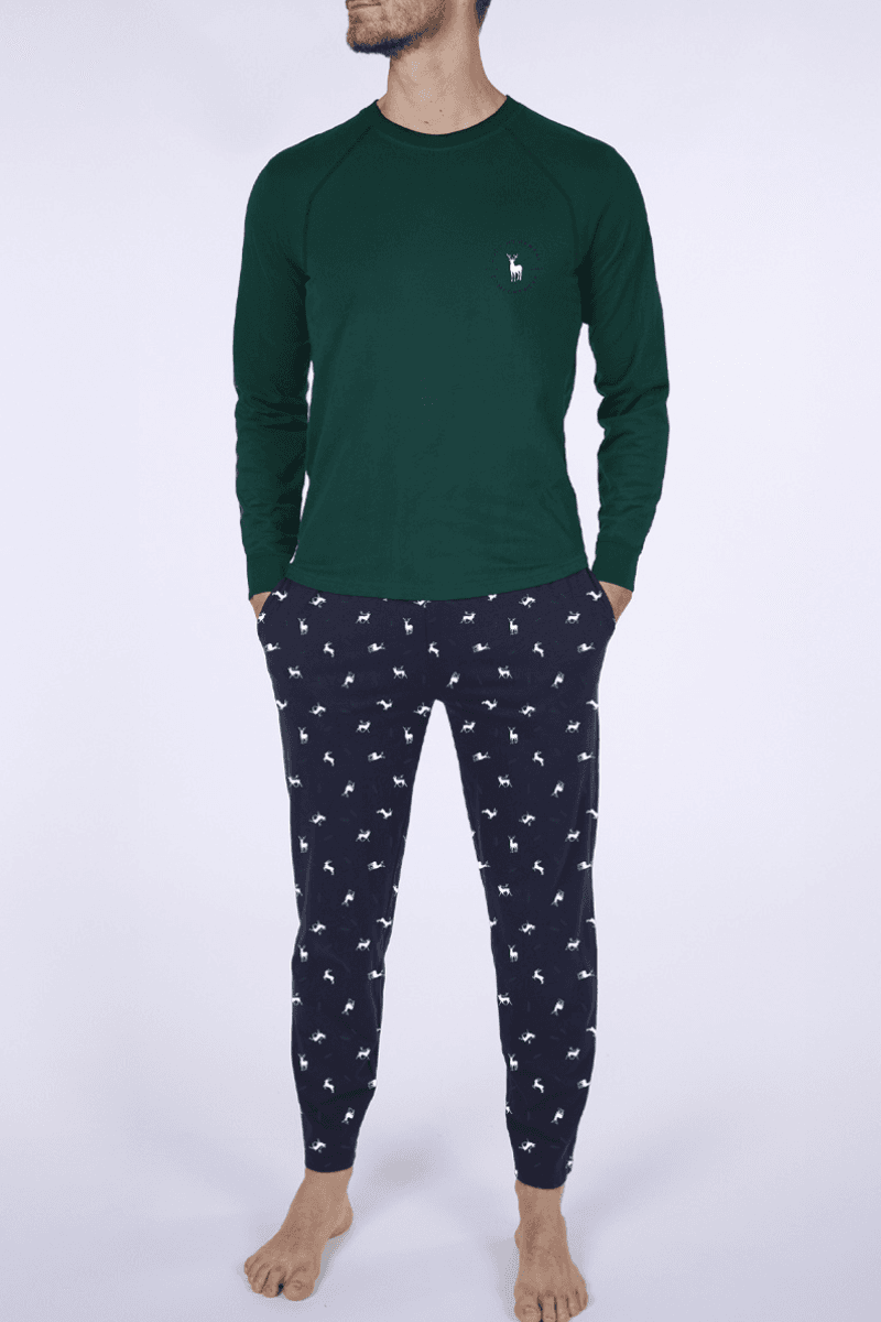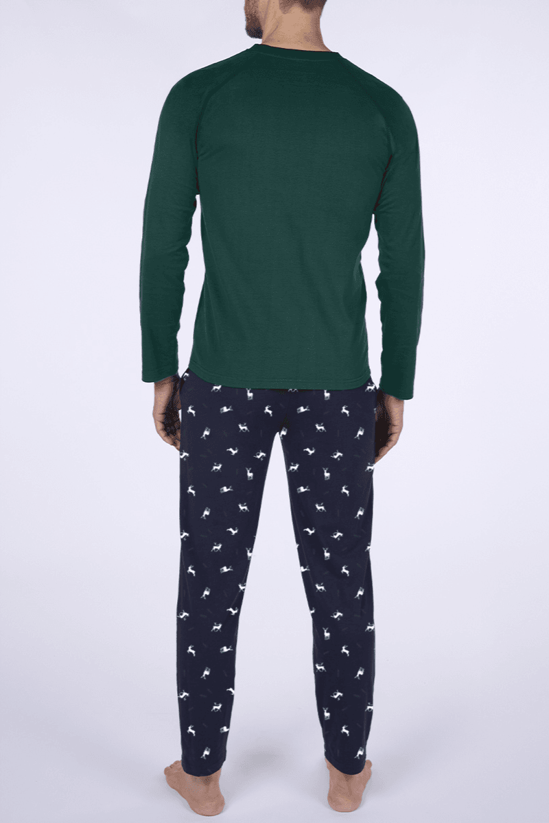Ανδρική πιτζάμα με μοντέρνο και παιχνιδιάρικο ύφος από την DODO HOMEWEAR. Η πράσινη μπλούζα συνδυάζεται με μπλε παντελόνι που διακοσμείται με μικρά λευκά σχέδια ελαφάκι. Άνετη, μαλακή και ιδανική για τις χειμωνιάτικες βραδιές στο σπίτι ή και για δώρο.
