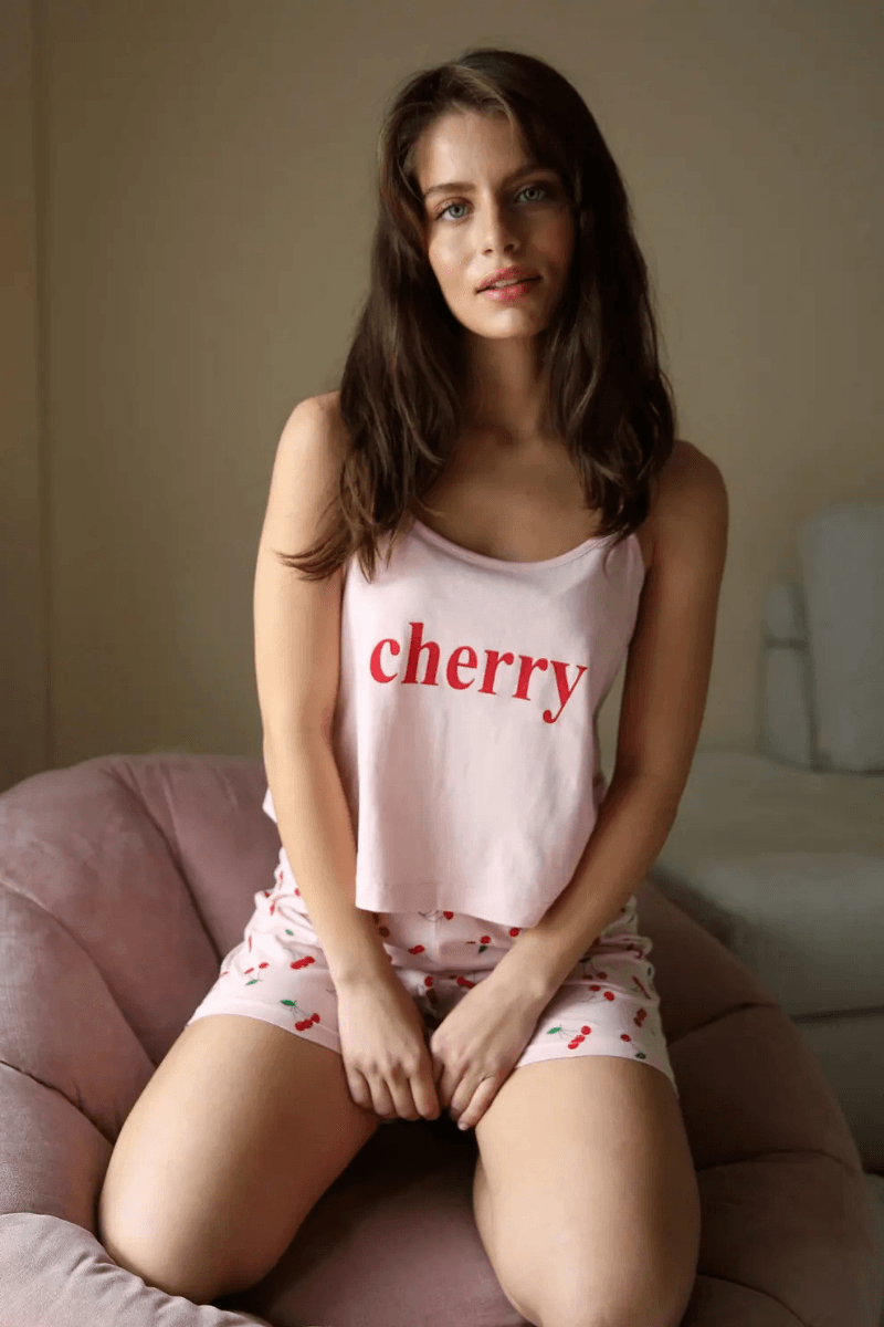 Φρουτώδης διάθεση και άνεση σε μια ροζ γυναικεία πιτζάμα από την Happy Family! Το σετ περιλαμβάνει cropped top με λεπτές τιράντες και τύπωμα “cherry” σε έντονο κόκκινο, συνδυασμένο με σορτς που κοσμείται με χαριτωμένα μοτίβα από κερασάκια. Ένα φρέσκο και παιχνιδιάρικο σετ ιδανικό για τις ζεστές νύχτες ή τις χαλαρές στιγμές στο σπίτι.