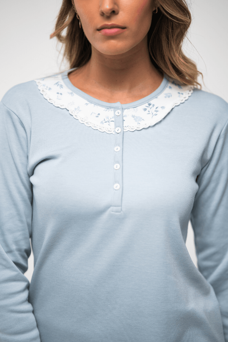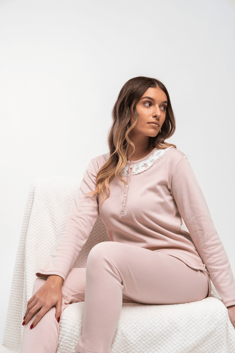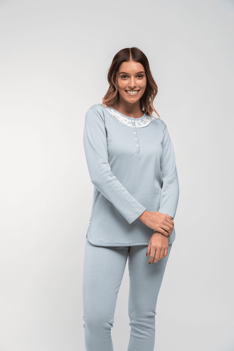 Γυναικεία πιτζάμα της εταιρίας Mira. Ύφασμα υψηλής ποιότητας από 50% βαμβακερό και 50% πολυεστέρας με ζεστή εσωτερική επένδυση τύπου fleece. Η πιτζάμα έχει στη μπλούζα κουμπιά και λεπτομέρεια από floral ύφασμα στο λαιμό. Το παντελόνι έχει ίσια γραμμή που προσφέρουν κομψότητα και άνεση. Ιδανική για χαλάρωση στο σπίτι ή για έναν ήρεμο ύπνο τους κρύους μήνες. Η εφαρμογή είναι άνετη, το ύφασμα έχει ελαστικότητα και τα χρώματα είναι ανεξίτηλα. Αντοχή στο συχνό πλύσιμο και στην καθημερινή χρήση.